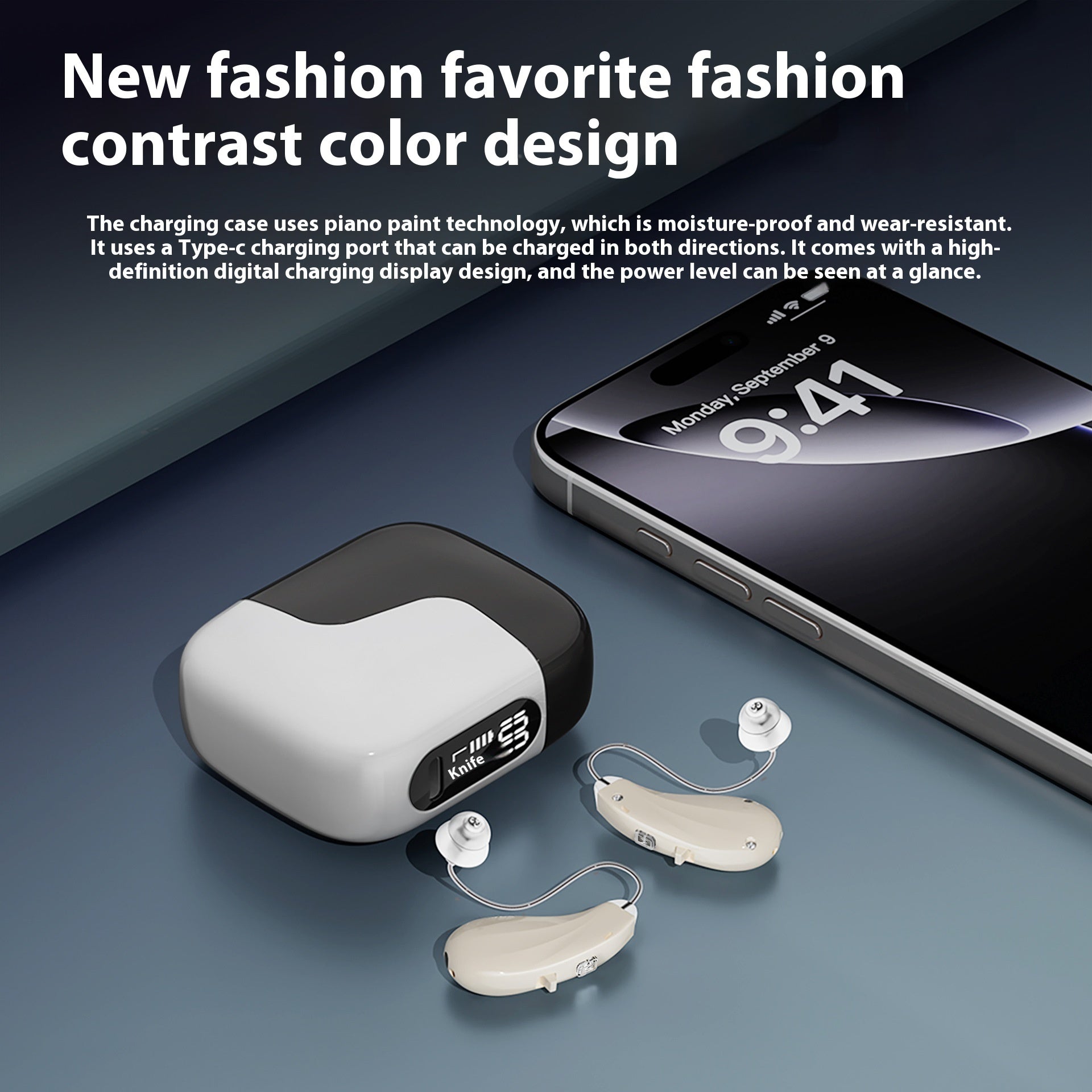Affordable elderly hearing aid with USB-C charging, 12+ hour battery life, and a stylish Warm Nebula Dual Machine color (black and white). Includes 1 hearing aid per pack. Rated voltage 3.7V.